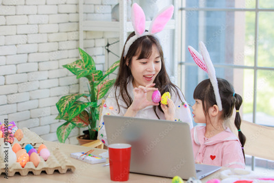 Asian young happy mother and little cute children daughter girl wearing funny bunny ears headbands with painting eggs while sitting together on table have laptop computer. Family celebrating Easter.