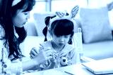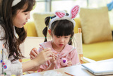 Asian young happy mother and little cute children daughter girl wearing funny bunny ears headbands with painting eggs while sitting together on table have laptop computer. Family celebrating Easter.