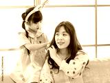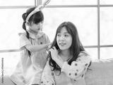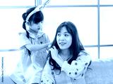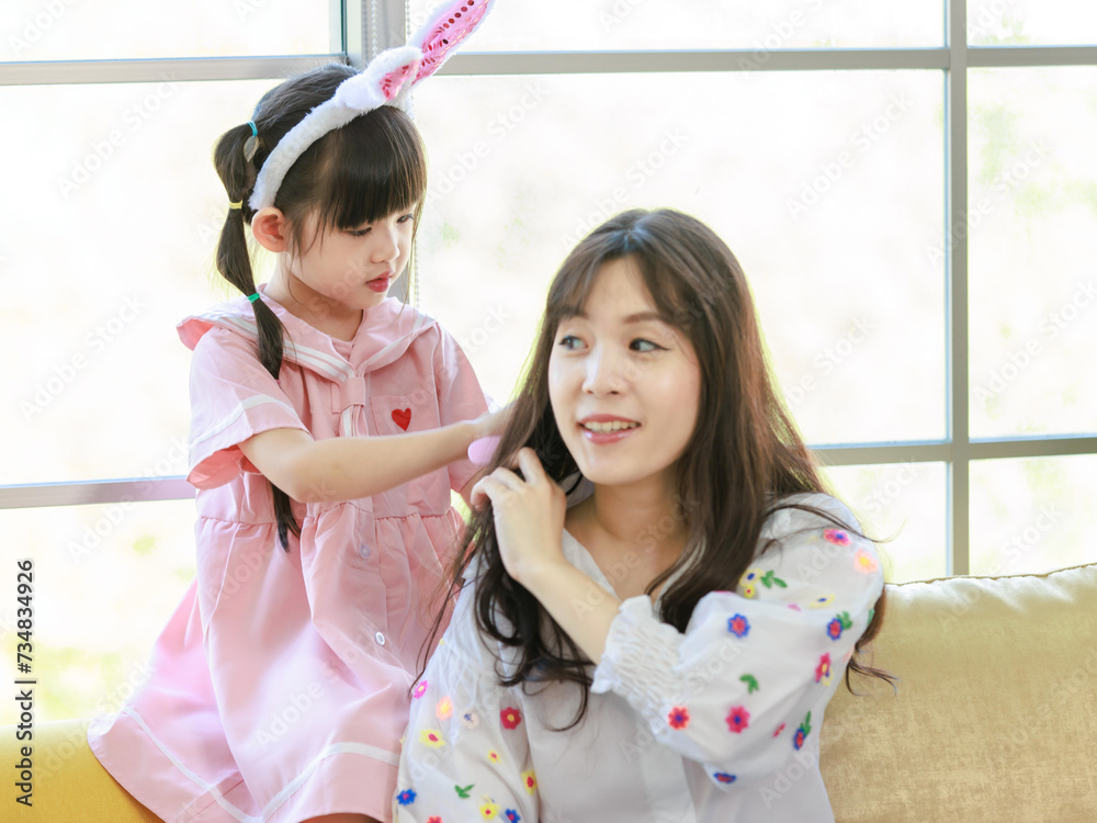 Asian daughter cute little children girl wearing funny bunny ears headbands hair brush mother from back standing on yellow sofa, her mom playing tablet in living room at home, Family celebrate Easter