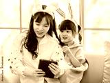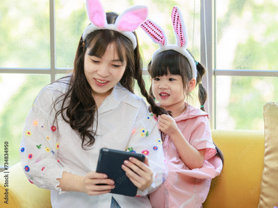 Happy asian daughter cute little children girl wearing funny bunny ears headbands sitting on cozy yellow sofa laugh smile with her mom playing tablet, in living room at home, Family celebrate Easter.