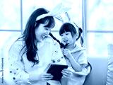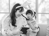 Happy asian daughter cute little children girl wearing funny bunny ears headbands sitting on cozy yellow sofa laugh smile with her mom playing tablet, in living room at home, Family celebrate Easter.