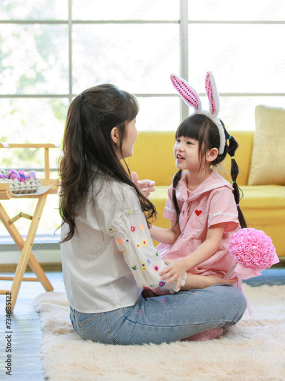 Asian cute little daughter girl is congratulating her pretty mother and giving flowers pink roses. Mum and girl smile loving happy, Family holiday and togetherness, Mother's Day celebration.