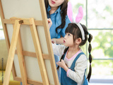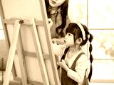 Portrait shot of smiling young asian woman pretty mother helping little cute daughter girl paint picture on canvas having fun together and spending family leisure time in living room at home.