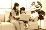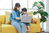 Asian young mother and her little cute daughter girl learning study from laptop computer, sitting on yellow sofa in living room at home, Happy family, Education and early development concept.