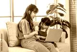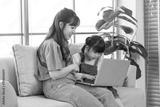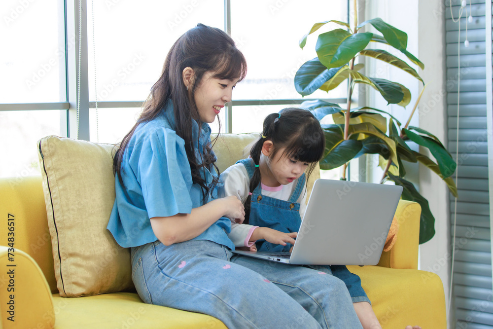 Asian young mother and her little cute daughter girl learning study from laptop computer, sitting on yellow sofa in living room at home, Happy family, Education and early development concept.