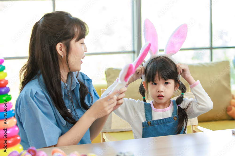 Asian cute little children girl wearing funny bunny ears headbands and young happy mother smile decorating painting eggs while sitting together in living room table family preparing for Easter holiday