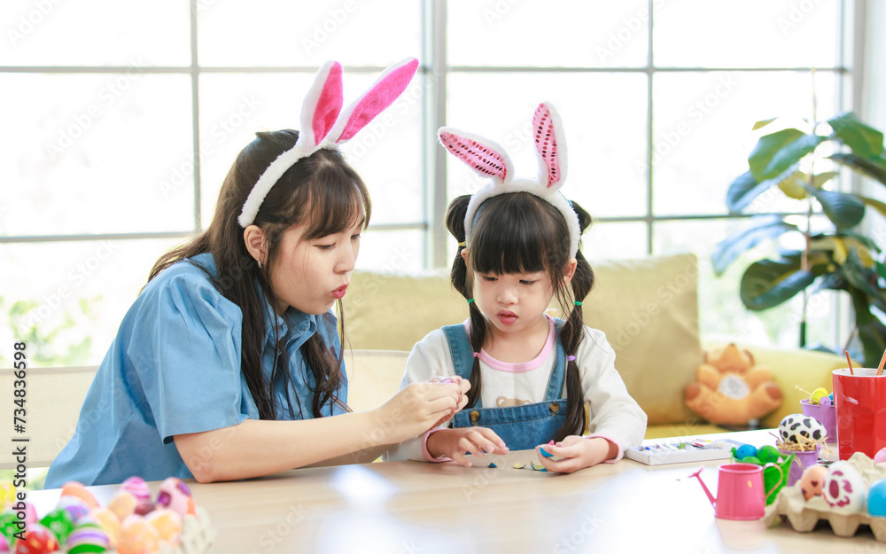 Asian cute little children girl wearing funny bunny ears headbands and young happy mother smile decorating painting eggs while sitting together in living room table family preparing for Easter holiday