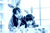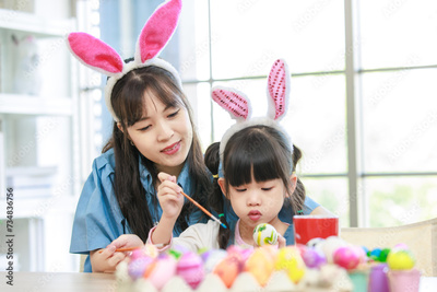 Asian cute little children girl wearing funny bunny ears headbands and young happy mother smile decorating painting eggs while sitting together in living room table family preparing for Easter holiday