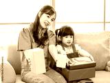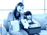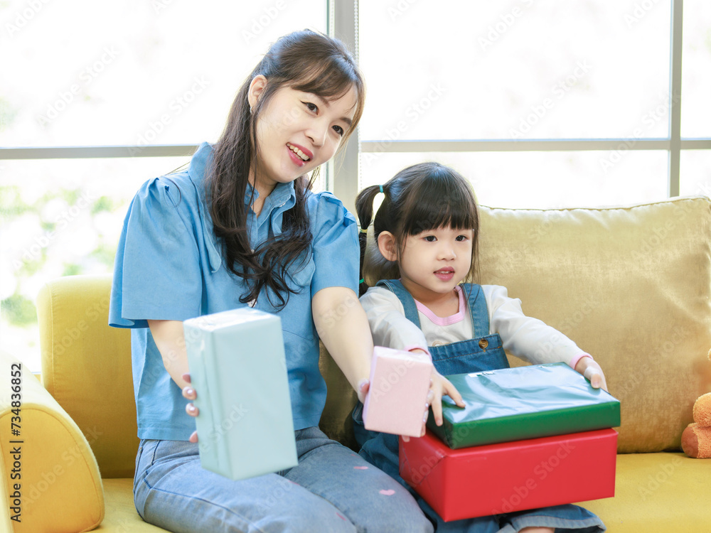 Happy mother's day Asian little cute girl child congratulating mom. Young mother and daughter smiling and holding gift on yellow cozy sofa in living room at home, Family holiday and togetherness.