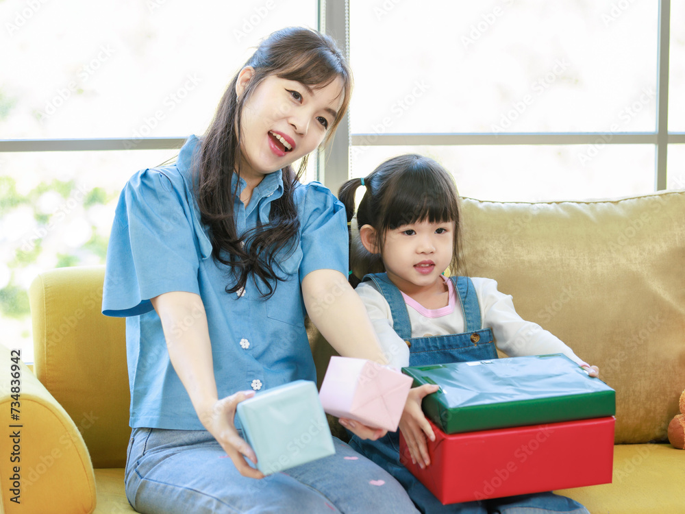 Happy mother's day Asian little cute girl child congratulating mom. Young mother and daughter smiling and holding gift on yellow cozy sofa in living room at home, Family holiday and togetherness.