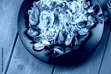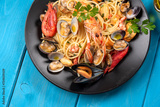 Piatto di deliziosi spaghetti ai frutti di mare, cibo italiano, cucina mediterranea
