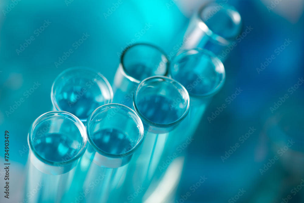 Chemical test tubes close-up with blue liquid. Medicine, pharmaceuticals, chemistry
