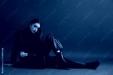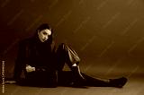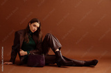 Fashionable confident woman wearing faux leather suit blazer, pants, pointed toe ankle boots, with trendy purple bag, posing on brown background. Full-length studio fashion portrait. Copy, empty space