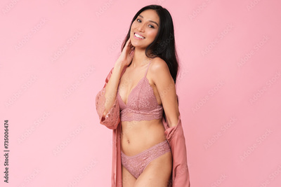 Beautiful brunette in pink lingerie and pajamas on a pink background.
