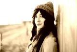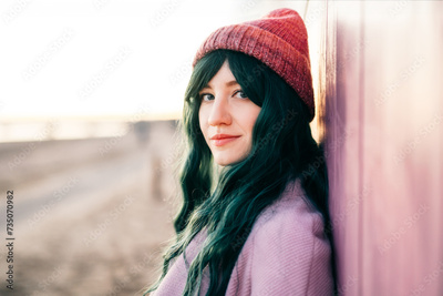 Portrait of relaxed stylish young smiling hipster woman with color hair wearing pink coat and knitted hat leaning on beach hut and enjoying moment. Simple pleasures and personal fulfillment.