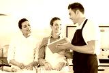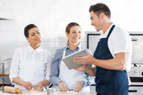 Happy Chefs Discussing Recipe On Digital Tablet In Kitchen