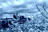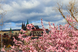 Hradcany hill with cathedral and castle on the background of blue sky and blooming pink cherry trees in springtime. Spring in Prague, Czech Republic