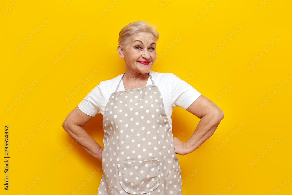 cheerful old grandmother housekeeper in an apron smiling on a yellow isolated background, elderly woman housewife looking into the camera
