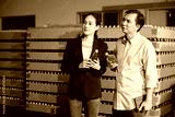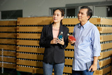 businessman and businesswoman checking basil seed drink or product in the beverage factory