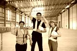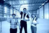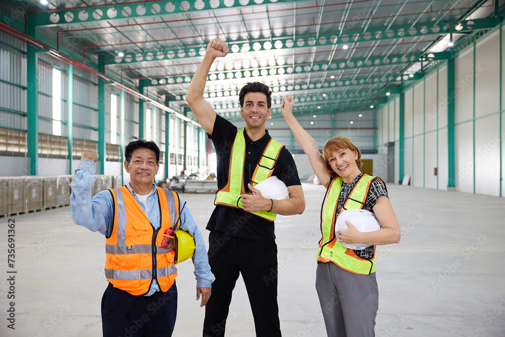 group of workers raise hand celebrate win pose after success work in the warehouse storage