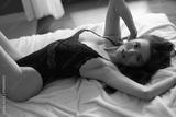 A beautiful brunette with a perfect body lies on a white fur coat.