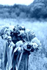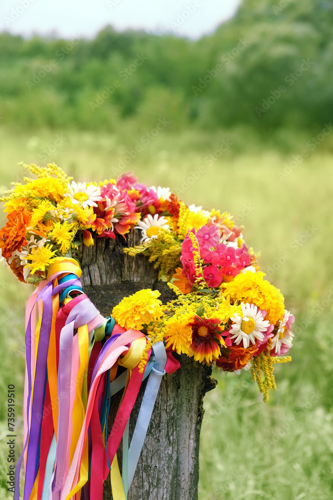flowers wreath with colorful ribbons on wooden post on meadow. summer background. Floral crown, symbol of Summer Solstice Day, Midsummer holiday, Litha sabbat. witch, wiccan ritual