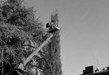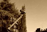 Two tree trimmers prunes a cypress from a cherry picker Blue sky on background