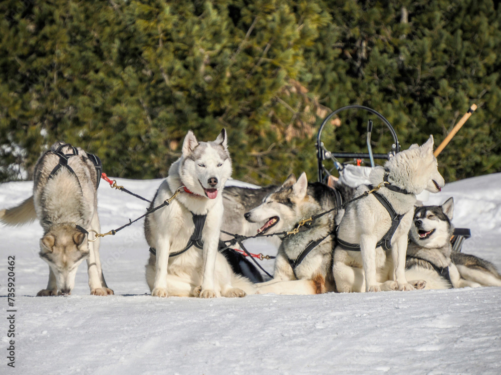 Sled dog with husky dogs in snow mountains white background in dolomites on sunny day