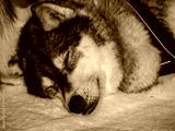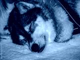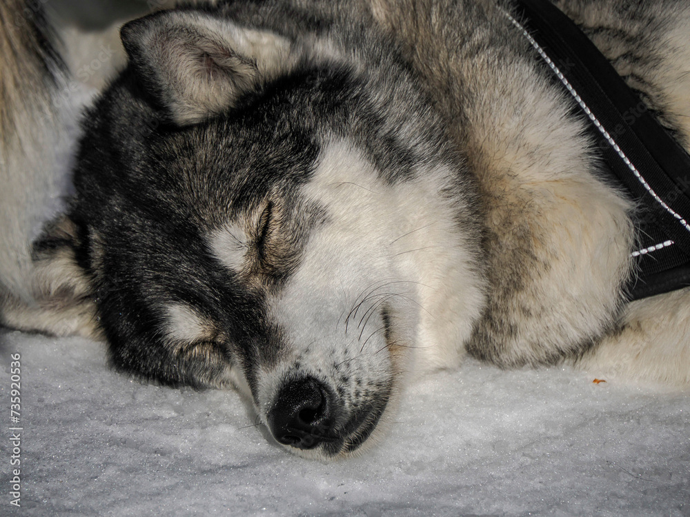 Sled dog with husky dogs resting in snow mountains white background in dolomites on sunny day