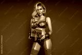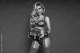 Sexy blonde woman in green elegant lingerie and stockings is holding red gift on a green background in the studio