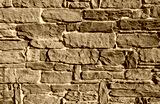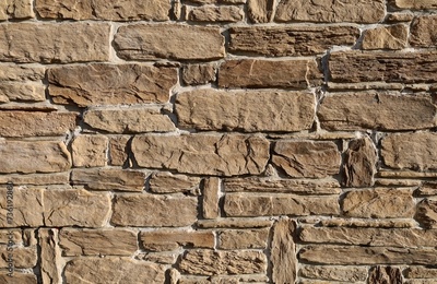 Stone wall made of brown natural rocks of different shapes and sizes on concrete. Background and texture.