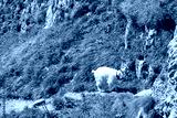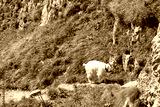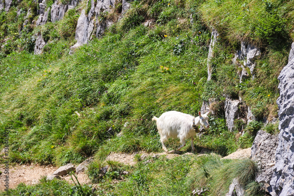 White goat with bell grazing in the Swiss Alps, near Appenzell in the Alpstein mountain range, Ebenalp, Switzerland