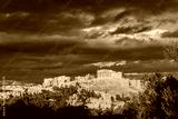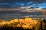 View of the Acropolis Hill, crowned with Parthenon during evening golden hour from the Philopappos Hill in Athens, Greece