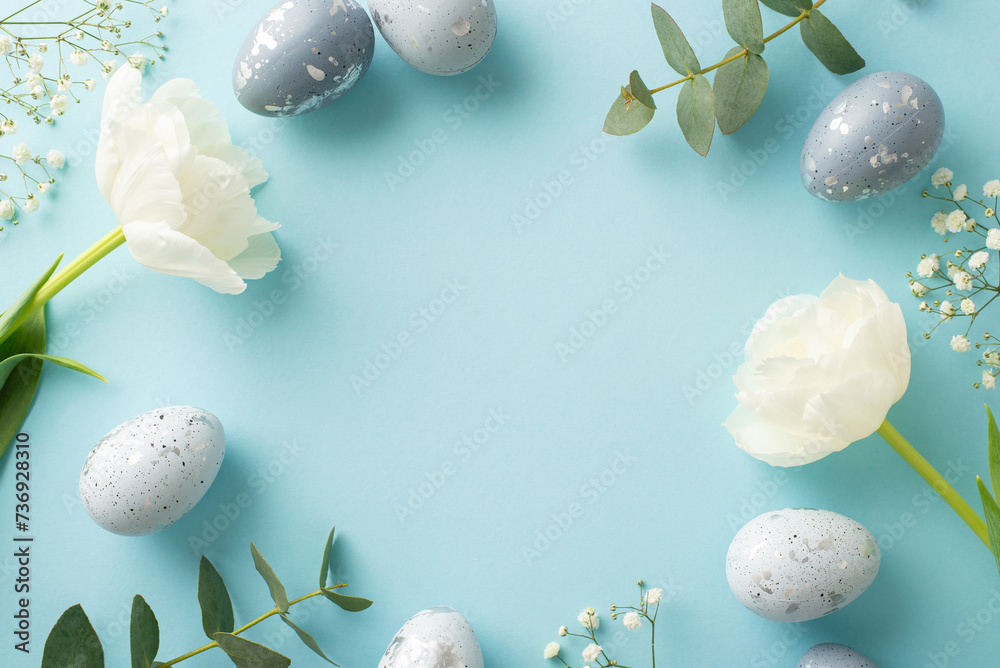 Seasonal elegance in a picture of slate grey eggs, alongside gypsophila, eucalyptus and tulips arranged on a pastel blue canvas, leaving margin for messages