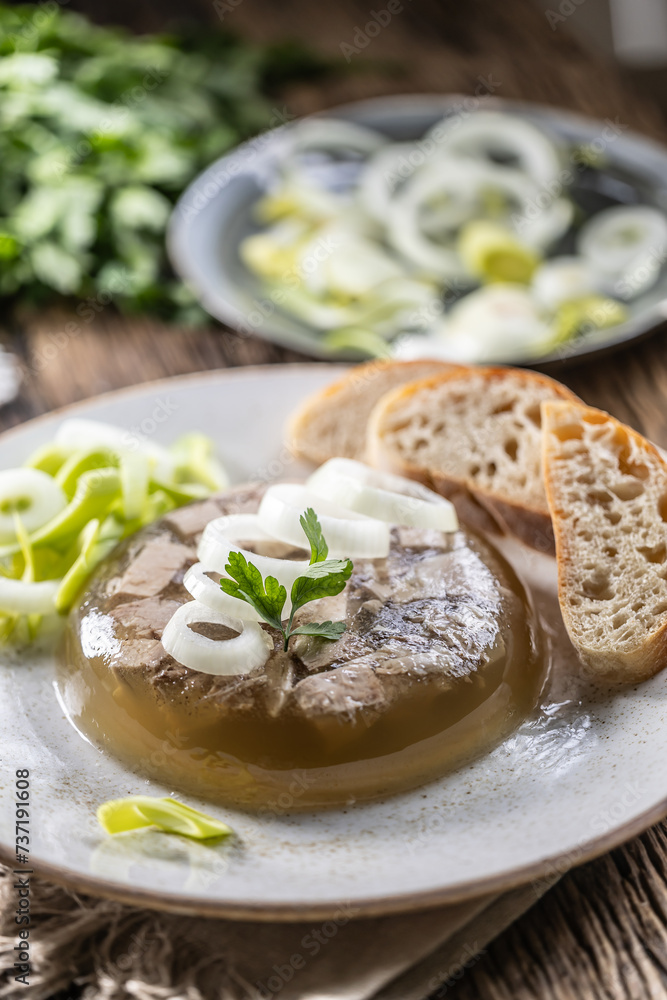 Homemade pork aspic, meat jelly with onion and leek in a white plate