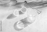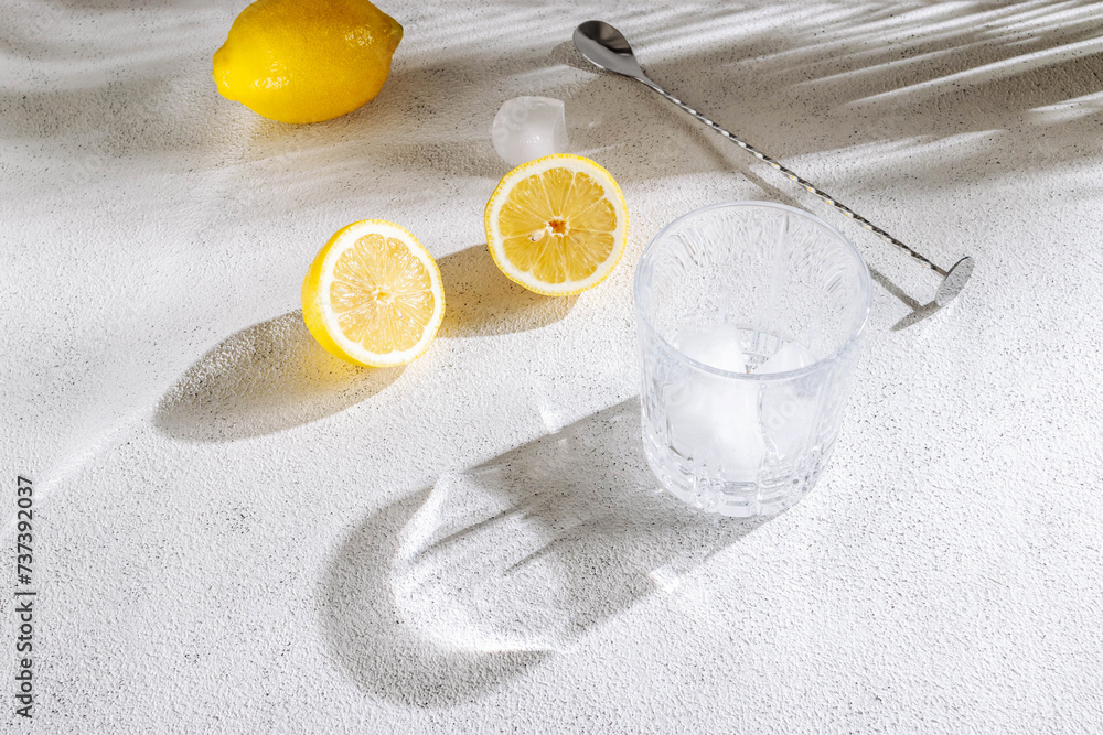 Crystal glass with ice cubes for making fresh lemonade. Ingredients for a refreshing drink