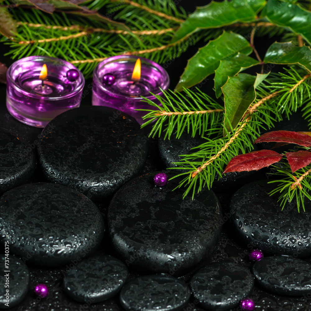 winter spa concept of zen basalt stones with drops, lilac candle