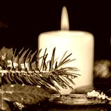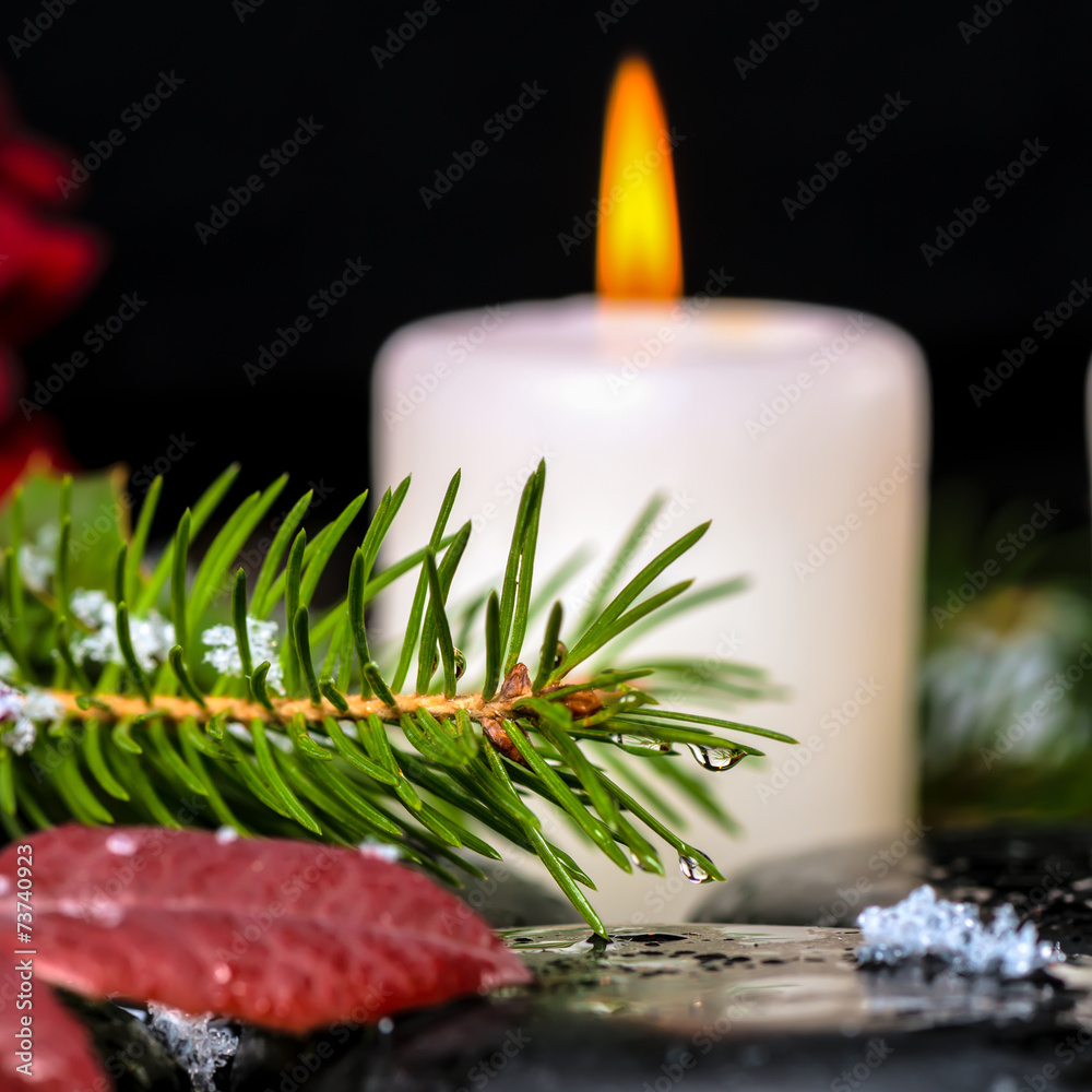 evergreen branches with drops, leaves, snow, candles and chrysa