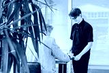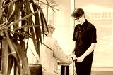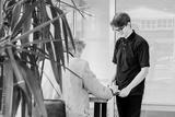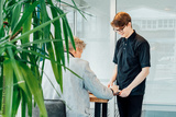 Friendly smiling young male waiter serves a client in cafe. Affable restaurant worker brings coffee drink. Man in cafeteria communicates with visitor accepts order. Student working part-time in cafe.