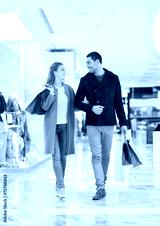 happy young couple with shopping bags in mall