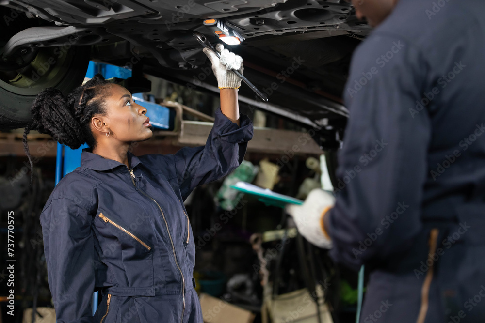 African female mechanic checking and fixing underneath car in automobile repair shop