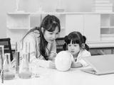Asian woman doctor physiotherapist explains human fake skeleton skull model on a table to little cute children girl at laboratory study room. Education anatomical human concept learning for kids.