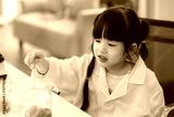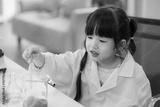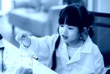 Asian little cute girl students in lab coat thinking making test tube science experiments chemical laboratory in study room at school. Education research and development concept learning kids.