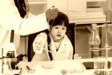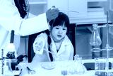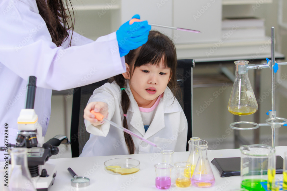 Asian woman scientist and little girl looking through magnifying glass making science experiments tests have microscope at chemical laboratory study room. Education concept learning for kids