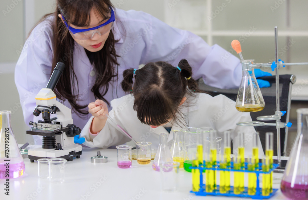Asian woman scientist and little girl looking through magnifying glass making science experiments tests have microscope at chemical laboratory study room. Education concept learning for kids