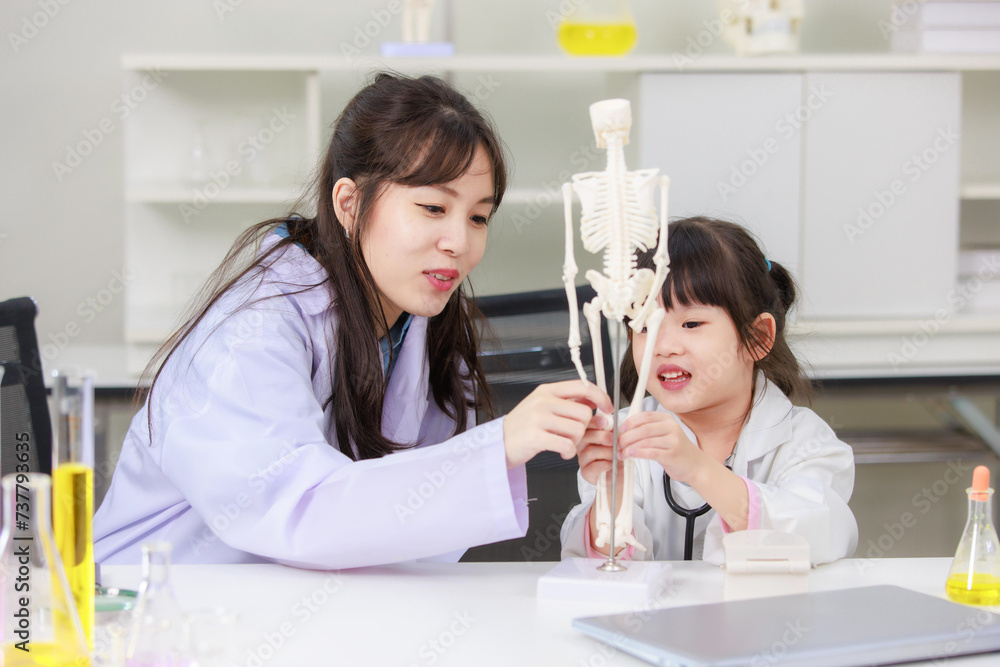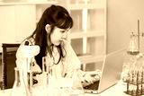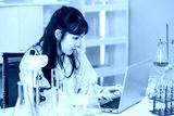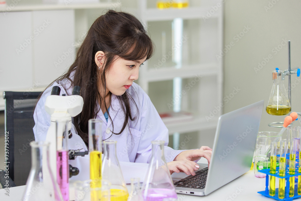 Asian woman female scientist concentrated on computer for research, reading data analysis and laboratory reports in solution chemical lab. Science or medical and medicine support on laptop.