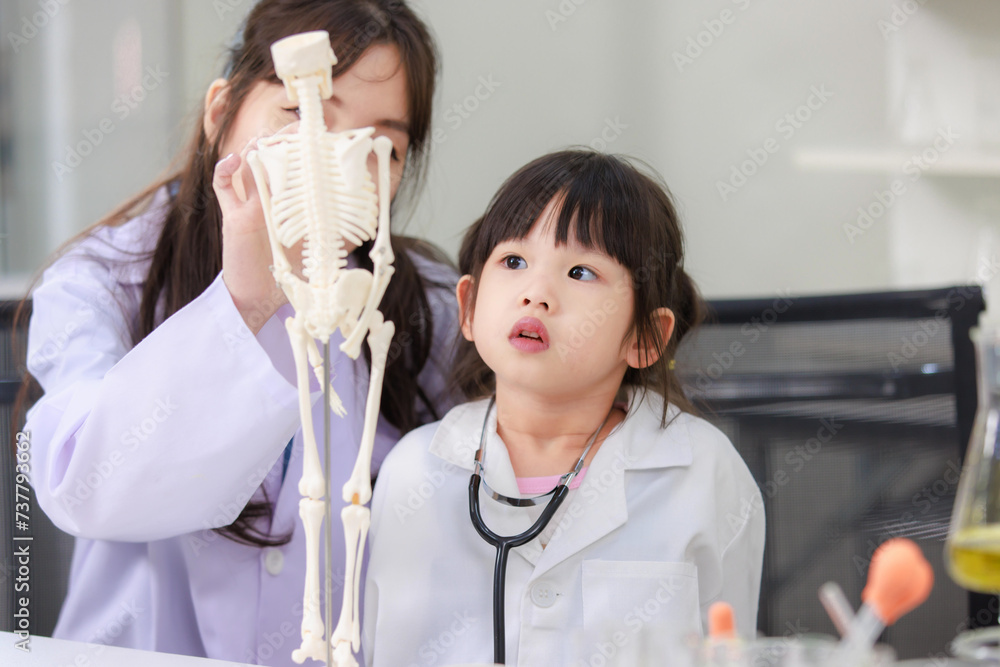 Asian woman doctor physiotherapist explains human fake skeleton hand model on a table to little cute children girl at laboratory study room. Education anatomical human concept learning for kids.