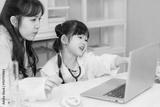 Asian woman teacher and little children girl reading laptop computer for data learning science at chemical laboratory study room. Education research and development concept learning for kids.