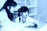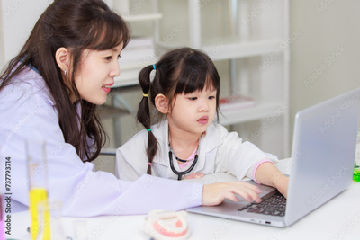 Asian woman teacher and little children girl reading laptop computer for data learning science at chemical laboratory study room. Education research and development concept learning for kids.