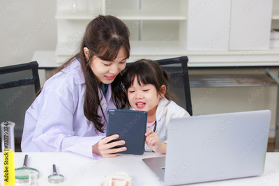 Asian woman scientist and little children girl reading laptop and tablet computer for data learning at chemical laboratory study room. Education research and development concept learning for kids.